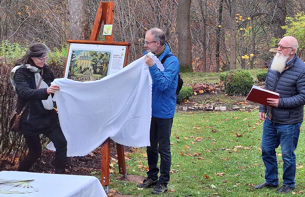 Und nicht nur das die neuen Besitzer waren auch bereit die Herstellung und Aufstellung der Staffelei – welche nun vor uns steht – finanziell abzusichern. So hatten wir vom Malerweg Sayda wieder einen neuen Sponsor gefunden.