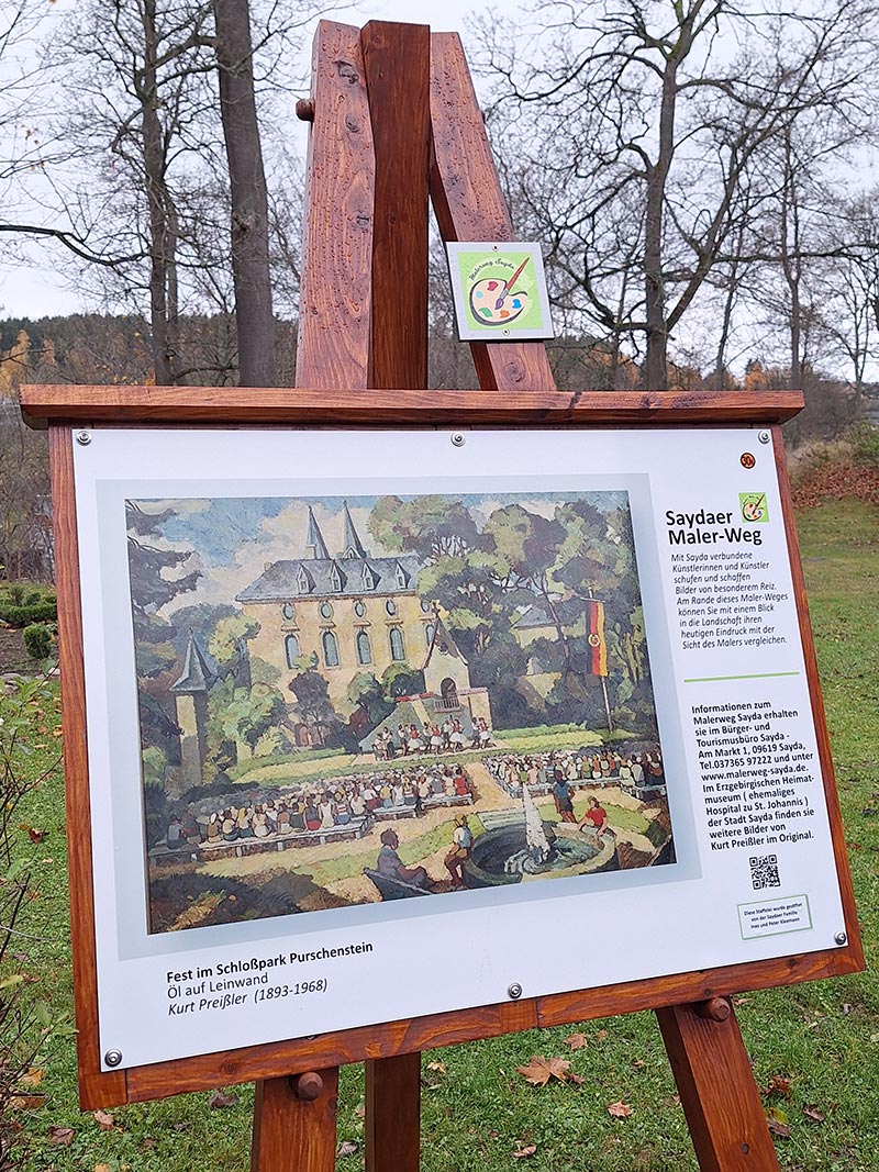 Danke nochmals an alle Unterstützer bei den Erweiterungen und der Unterhaltung des Malerweges Sayda – so z.B. auch an die Hausmeister vom Schloßhotel welche an dieser Staffelei Hand anlegten um sie fest im Boden zu verankern.